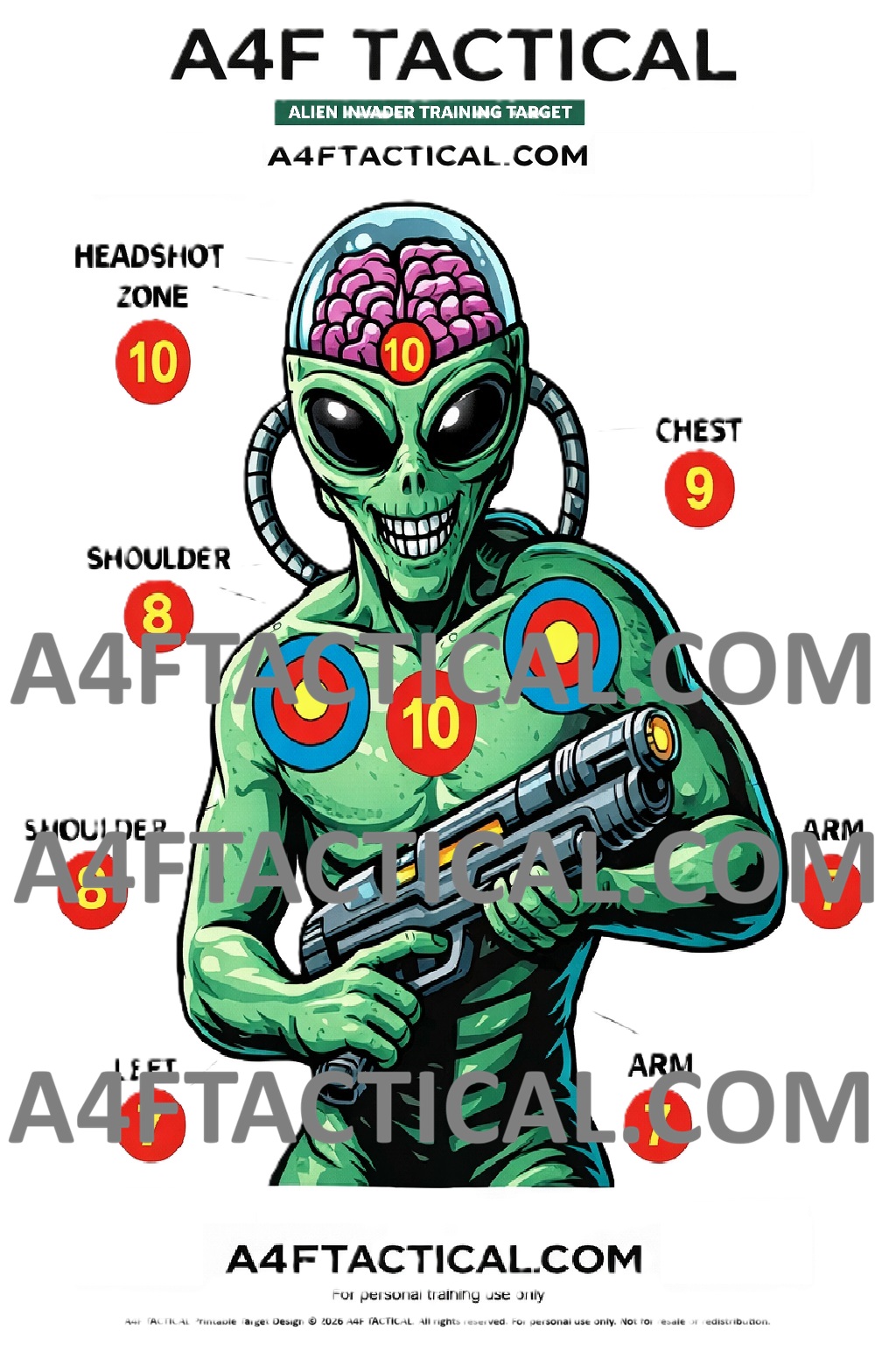 The A4F TACTICAL Alien Invader Shooting Target is a fun and challenging shooting target designed for shooters of all skill levels. This printable target allows you to practice your accuracy while enjoying a creative range experience.