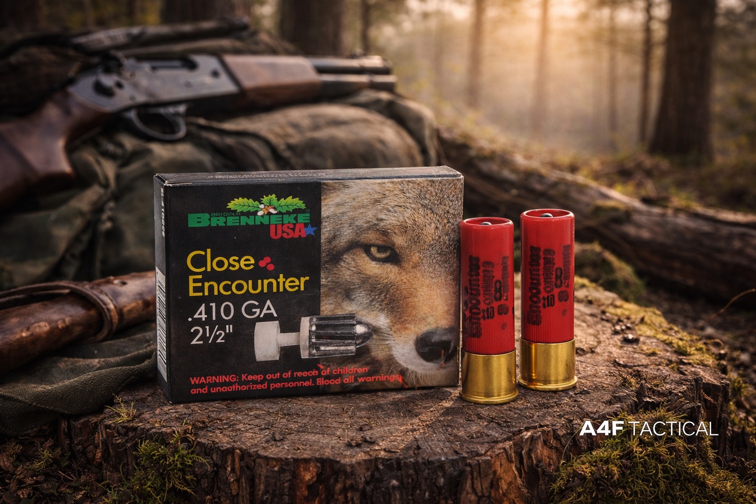 Resting on a weathered tree stump in the quiet of the forest, this scene captures the moment just before action. Morning light filters through the pines, illuminating the Brenneke Close Encounter .410 Bore slugs—compact, purposeful, and ready. The worn textures of bark and earth speak to time, patience, and respect for the outdoors, while the deep red shells stand in bold contrast against the muted woods. This is where preparation meets awareness—close ranges, tight quarters, and confidence built on reliable ammunition when encounters happen fast, and distance disappears.