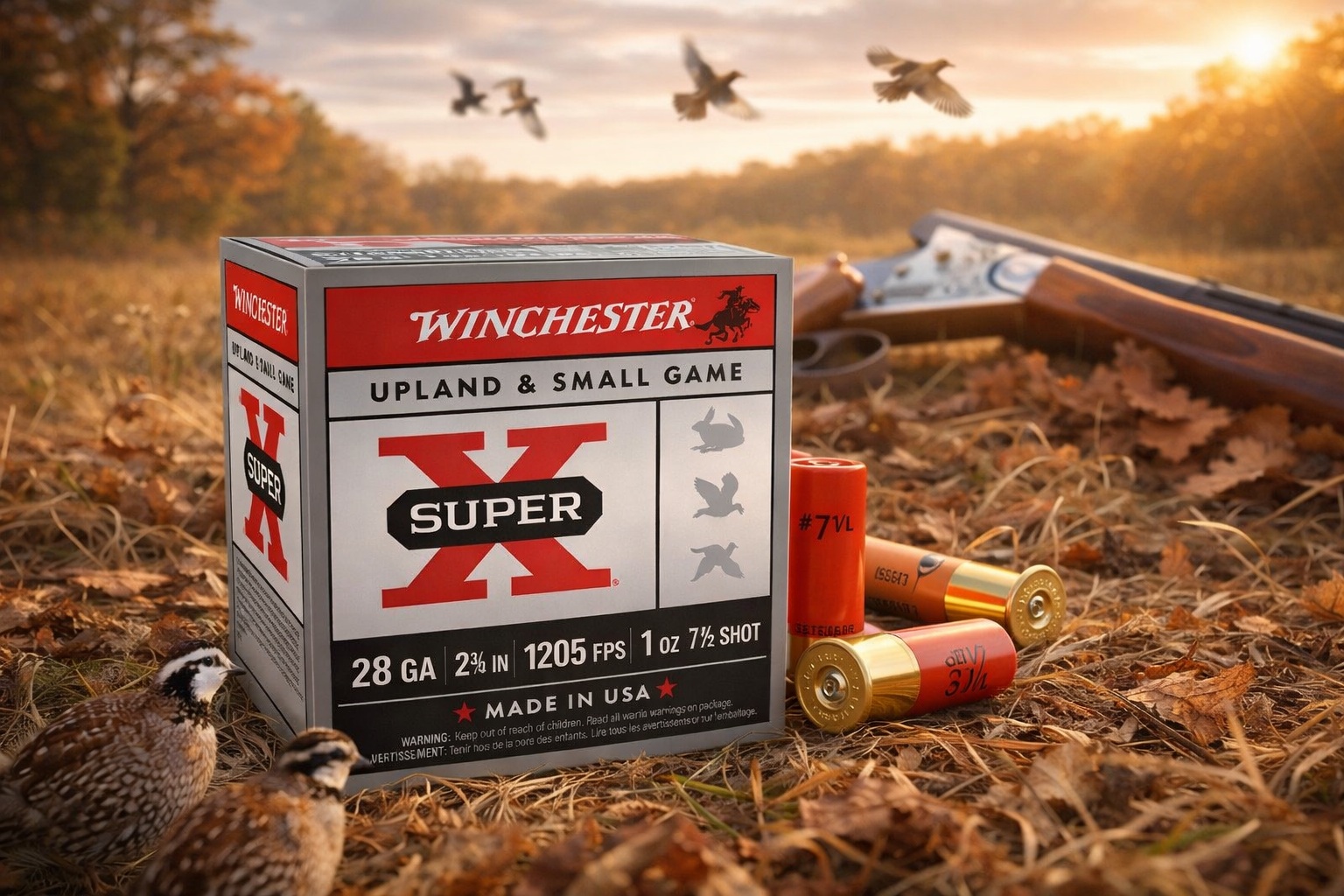 As the sun settles low over the field, the air grows still and the day’s warmth lingers in the grass. Dry leaves crunch underfoot, and the quiet is broken only by the sudden rise of wings against the sky. This moment—caught between patience and motion—is what upland hunting has always been about. Winchester Super-X 28-gauge game loads belong here, where tradition meets the open land. Trusted for generations, they represent early mornings, steady hands, and the simple joy of being outdoors, chasing birds across fields painted gold by the fading light. This image isn’t just a product on display—it’s the feeling of a hunt remembered long after the day is done.
